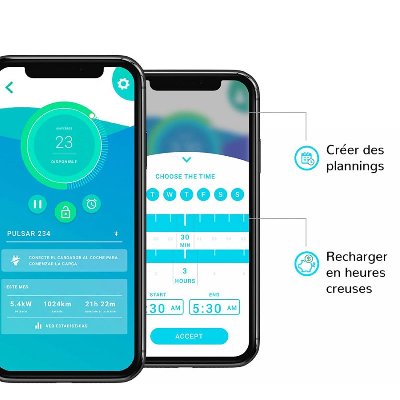 Grâce à l’application Wallbox, vous pouvez connecter votre borne à votre Smartphone par Bluetooth ou WiFi. L’application vous permettra gérer les paramètres suivants: